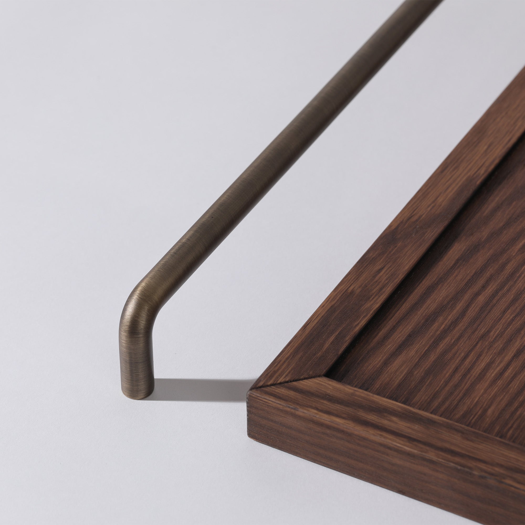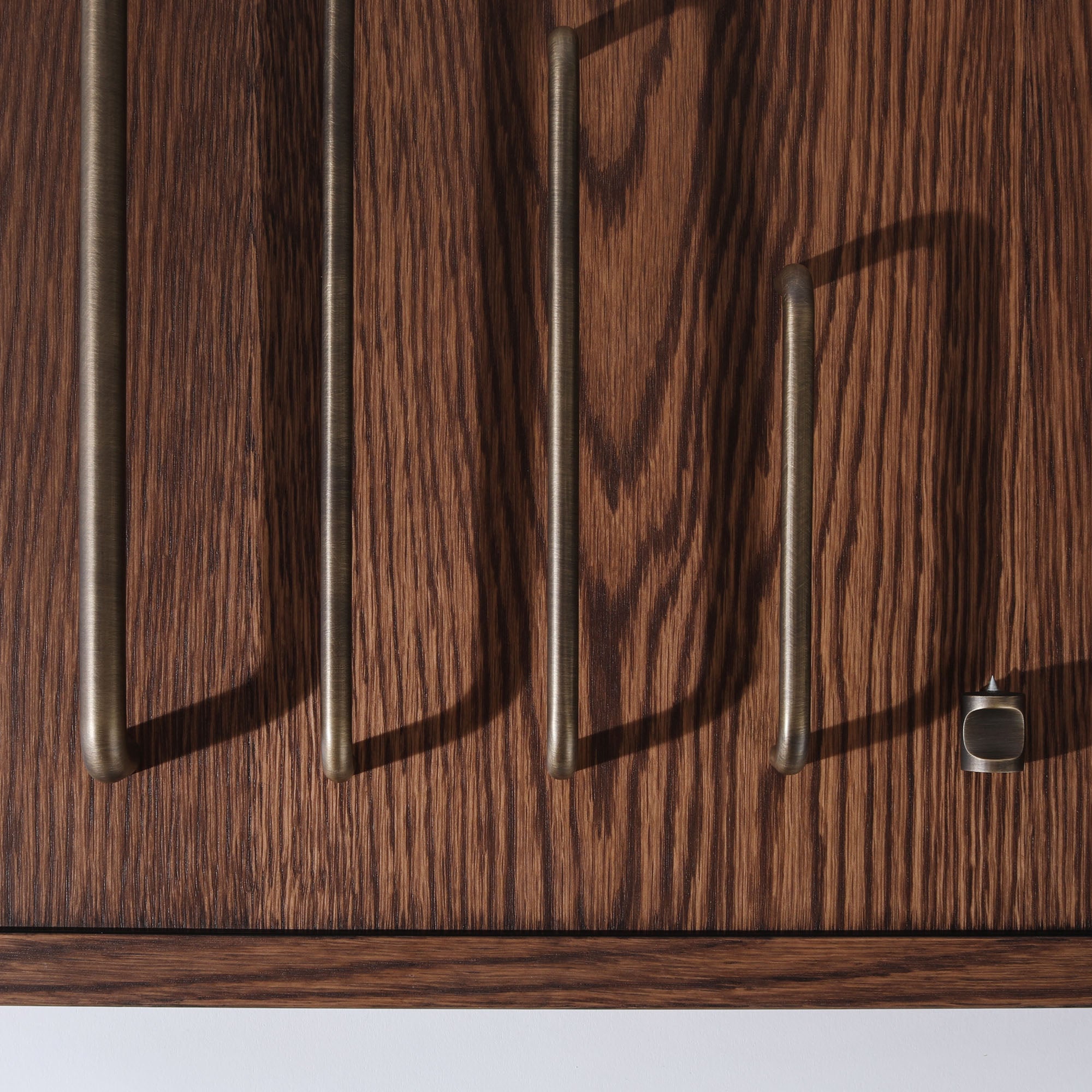 Made of solid brass and finished in electroplated English Bronze. The range has three handle sizes, an accompanying knob and an oversized pull for integrated appliances. In addition to English Bronze, the range is available in White and Burnished Brass.