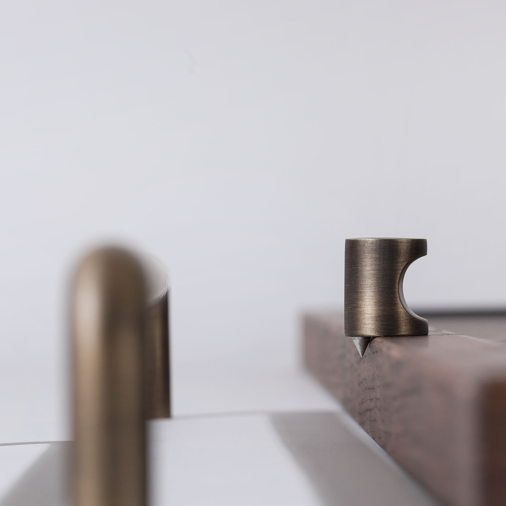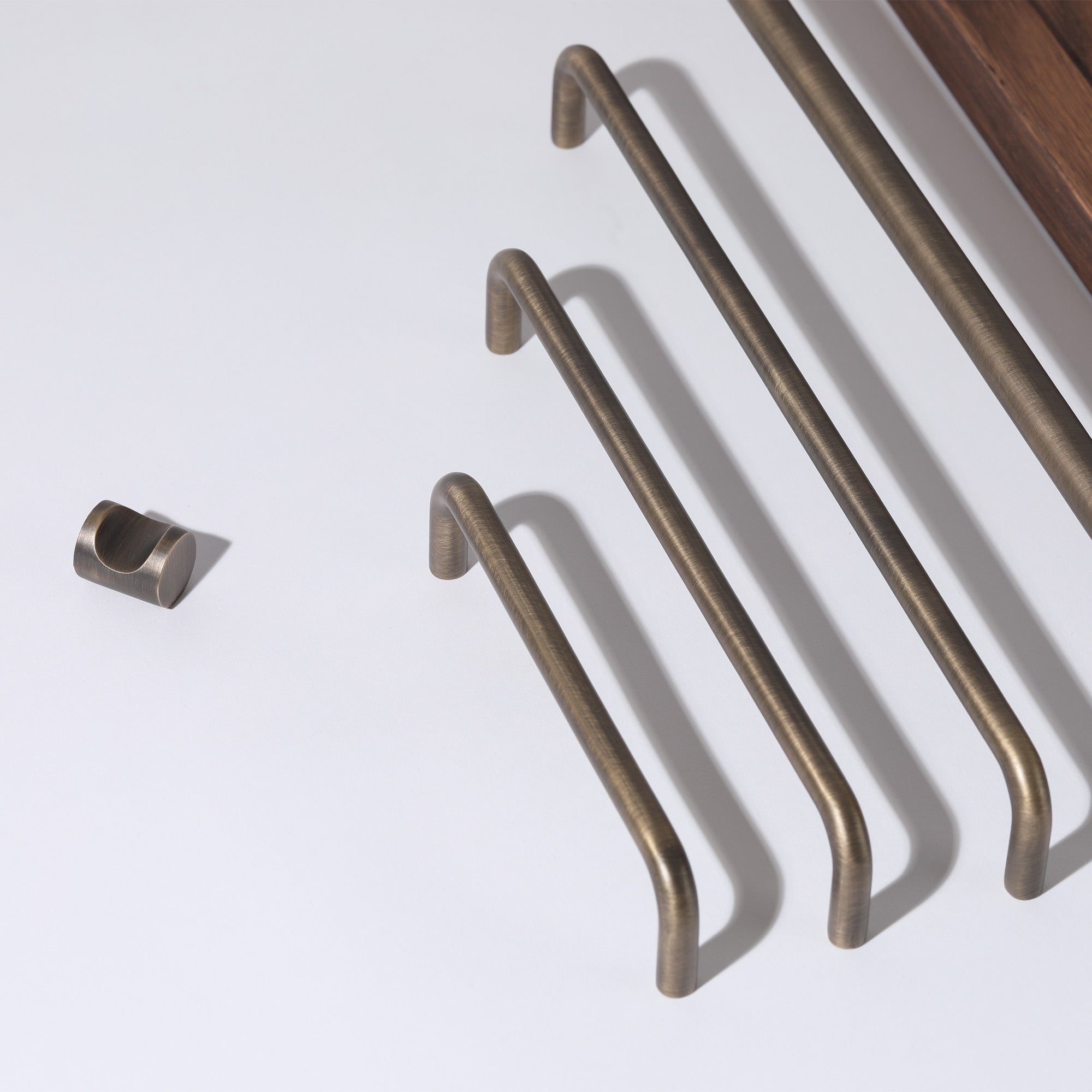 Made of solid brass with an electroplated bronze finish, the accompanying range has three handles of varying length and an oversized pull for integrated appliances. In addition to English Bronze, the range is available in Burnished Brass and White.